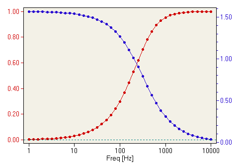 | Inductive Lowpass Filter. Load voltage (red) decreases with increasing frequency. Phase shifts from 0 to -π/2 radiants (blue curve). |
