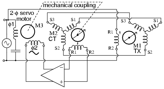 A variation of the synchro transmitter is the control transformer. It has three equally spaced stator windings like a TX. Its rotor is wound with more turns than a transmitter or receiver to make it more sensitive at detecting a null as it is rotated, typically, by a servo system. The CT (Control Transformer) rotor output is zero when it is oriented at a angle right angle to the stator magnetic field vector. Unlike a TX or RX, the CT neither transmits nor receives torque. It is simply a sensitive angular position detector.
