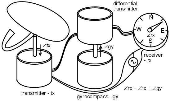A shipboard radar antenna coupled to a synchro transmitter encodes the antenna angle with respect to ship's bow. It is desired to display the antenna position with respect to true north. We need to add the ships heading from a gyrocompass to the bow-relative antenna position to display antenna angle with respect to true north. ∠antenna + ∠gyro